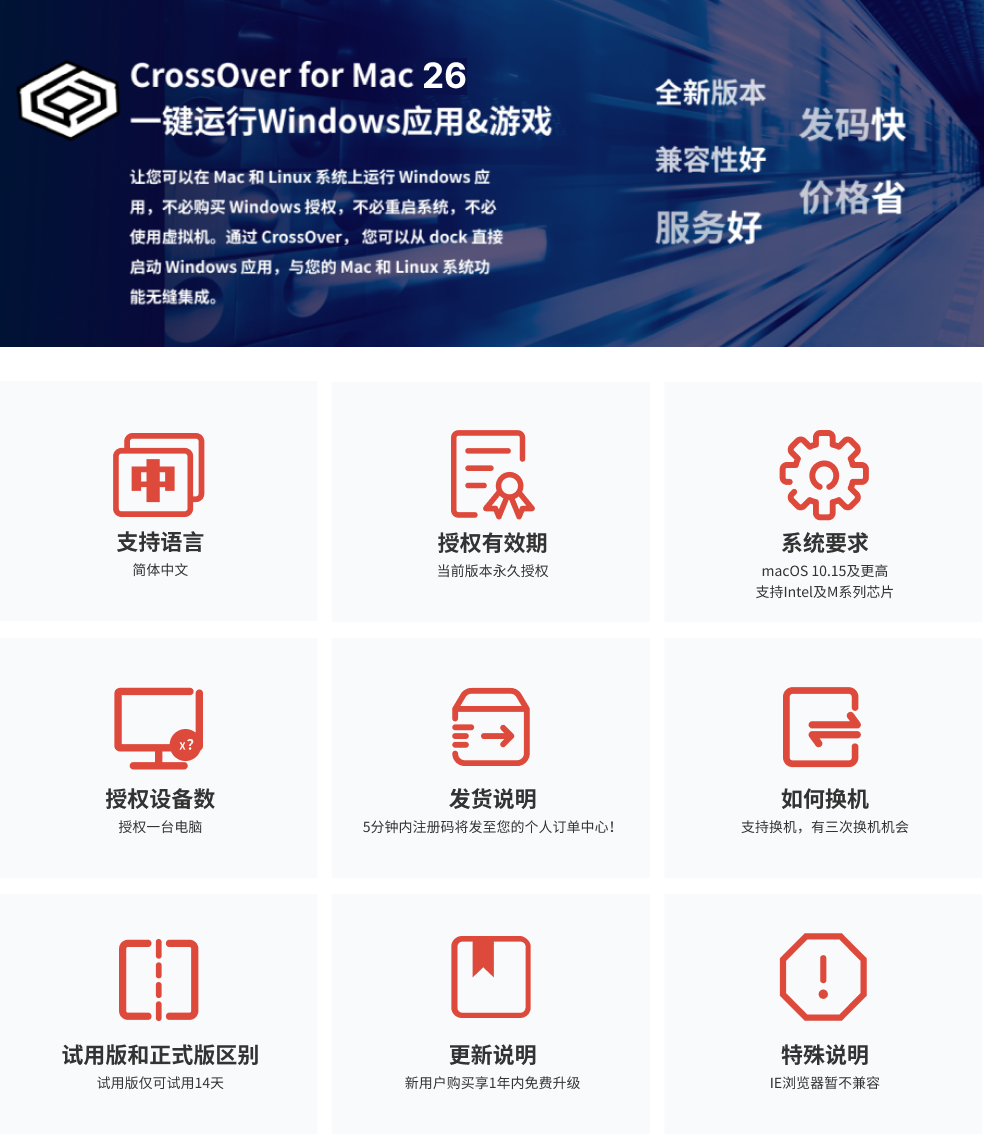 答:CrossOver为一机一码制,用户购买软件以后只能激活一台mac,不可重复激活。