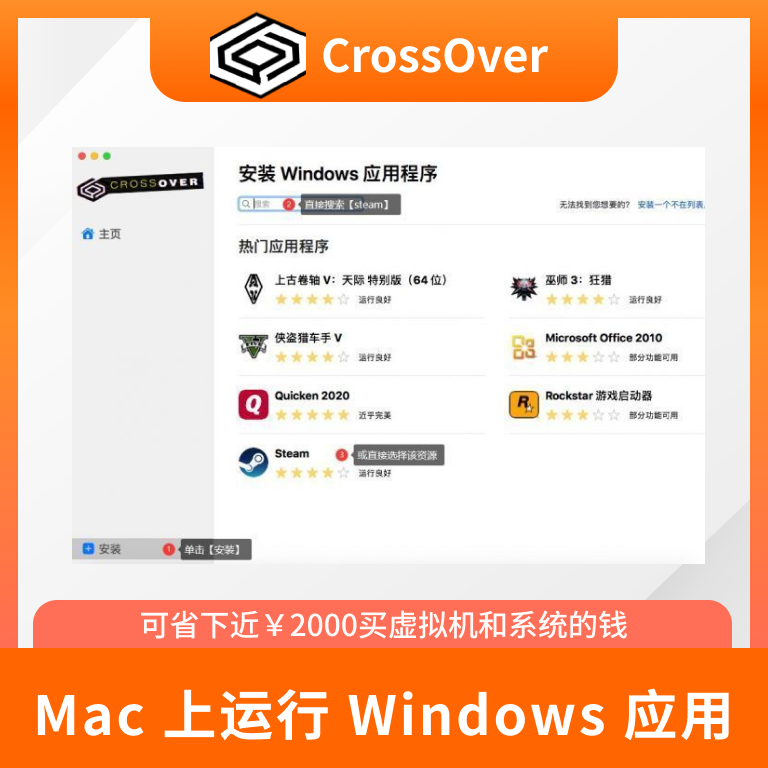 CrossOver 的一键安装技术让用户安装 Windows 应用程序变得非常简单。只要点一下“安装”按钮,就可以从我们的海量兼容中心中安装您想要的应用程序。