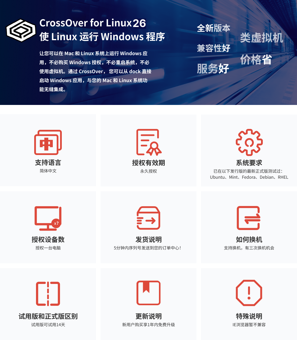 CrossOver 可以让您像运行原生应用一样,无需虚拟机,直接从您的 Mac 或 Linux 系统上运行您的 Windows 应用,不需要重新启动,也不需要虚拟机,更不需要将文件从一个系统复制到另一个系统。