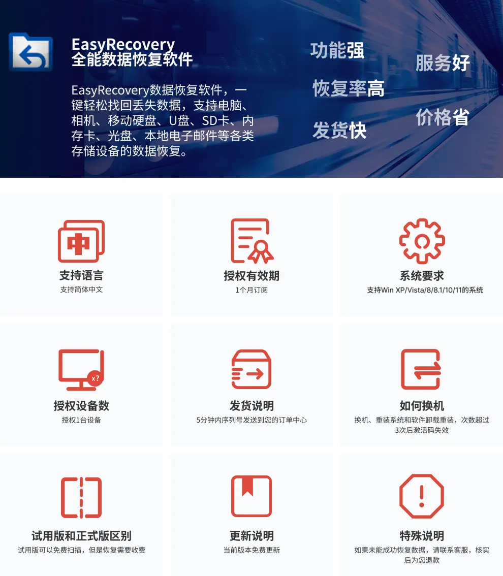 | 产品 | EasyRecovery 17个人版(Win) | EasyRecovery 17专业版(Win) | EasyRecovery 17企业版(Win) |