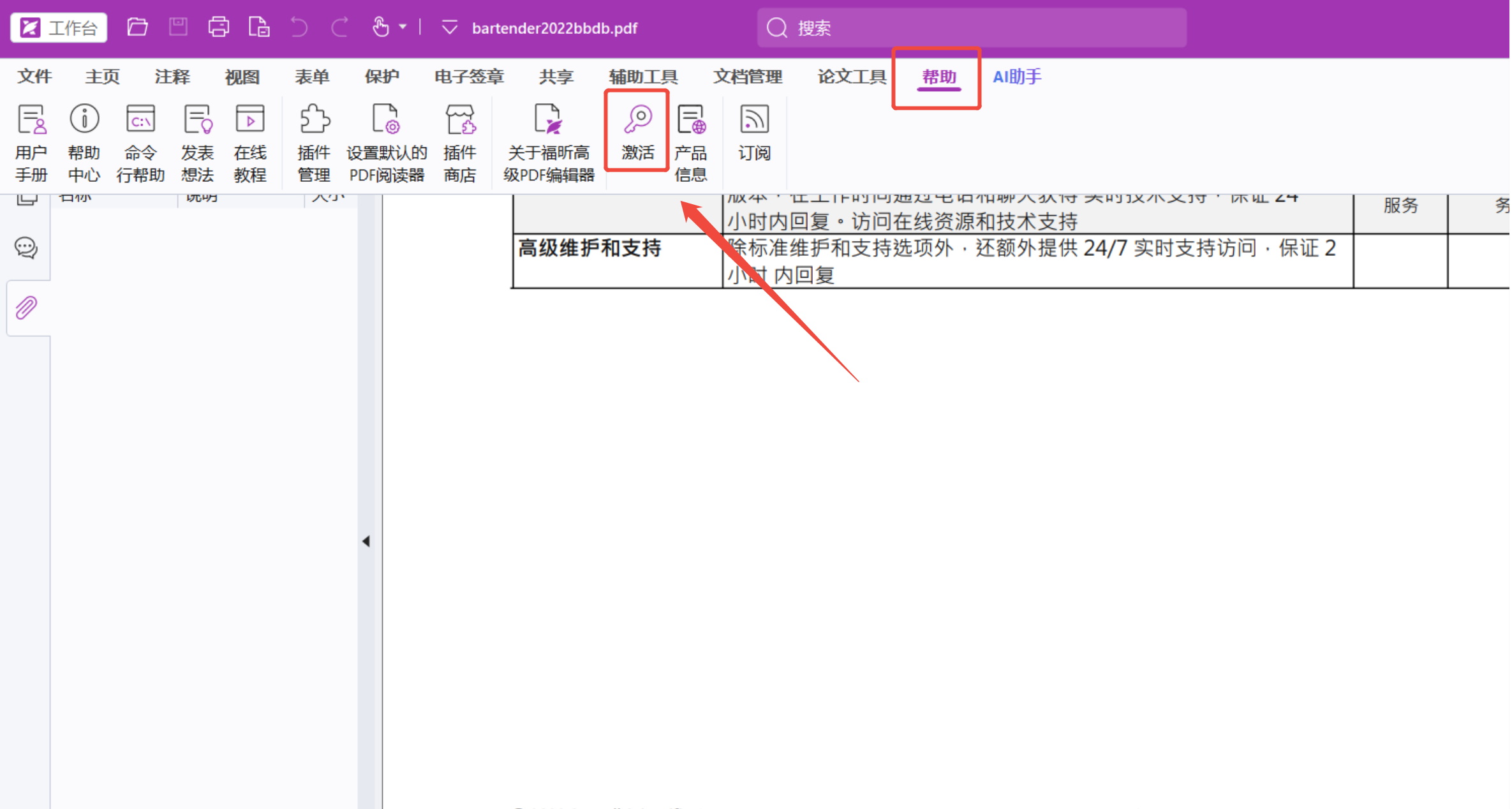 2、打开软件福昕PDF高级编辑器,点击顶部的【帮助】——【激活】