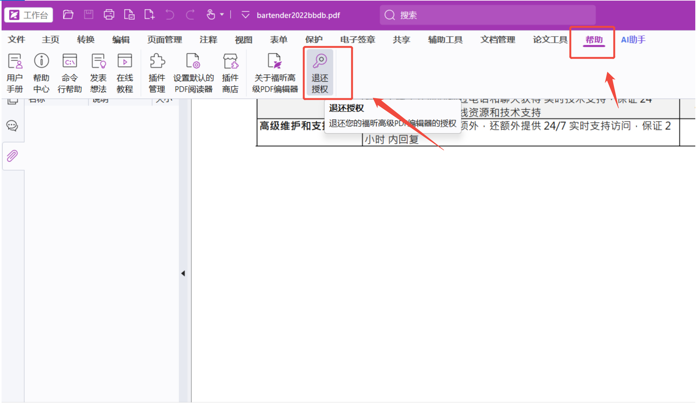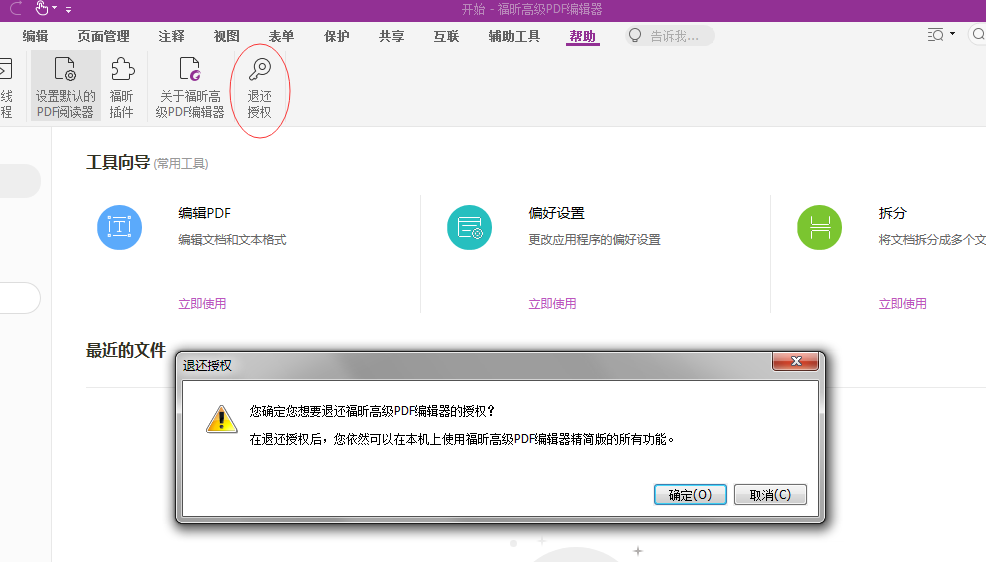 1、打开福昕高级PDF编辑器,在顶部找到【帮助】,点击【退还授权】,然后点击【确认】
