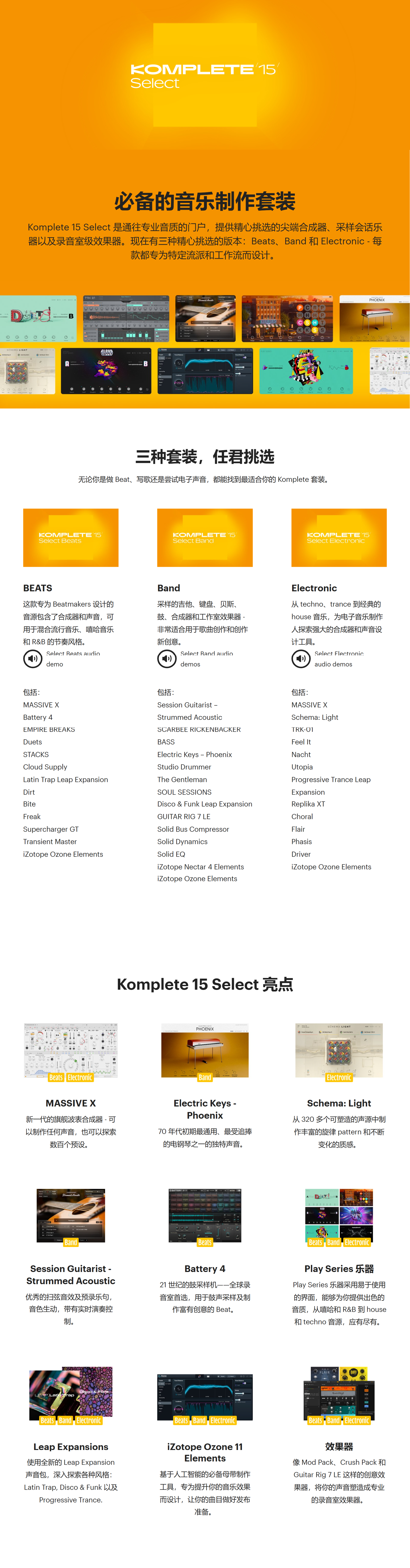 NI KOMPLETE 15 SELECT Electronic版本,专为电子音乐制作人设计,含旗舰合成器、声音设计工具及电音扩展包,适配Techno、Trance、House等曲风,解锁更多电子音乐创作可能。