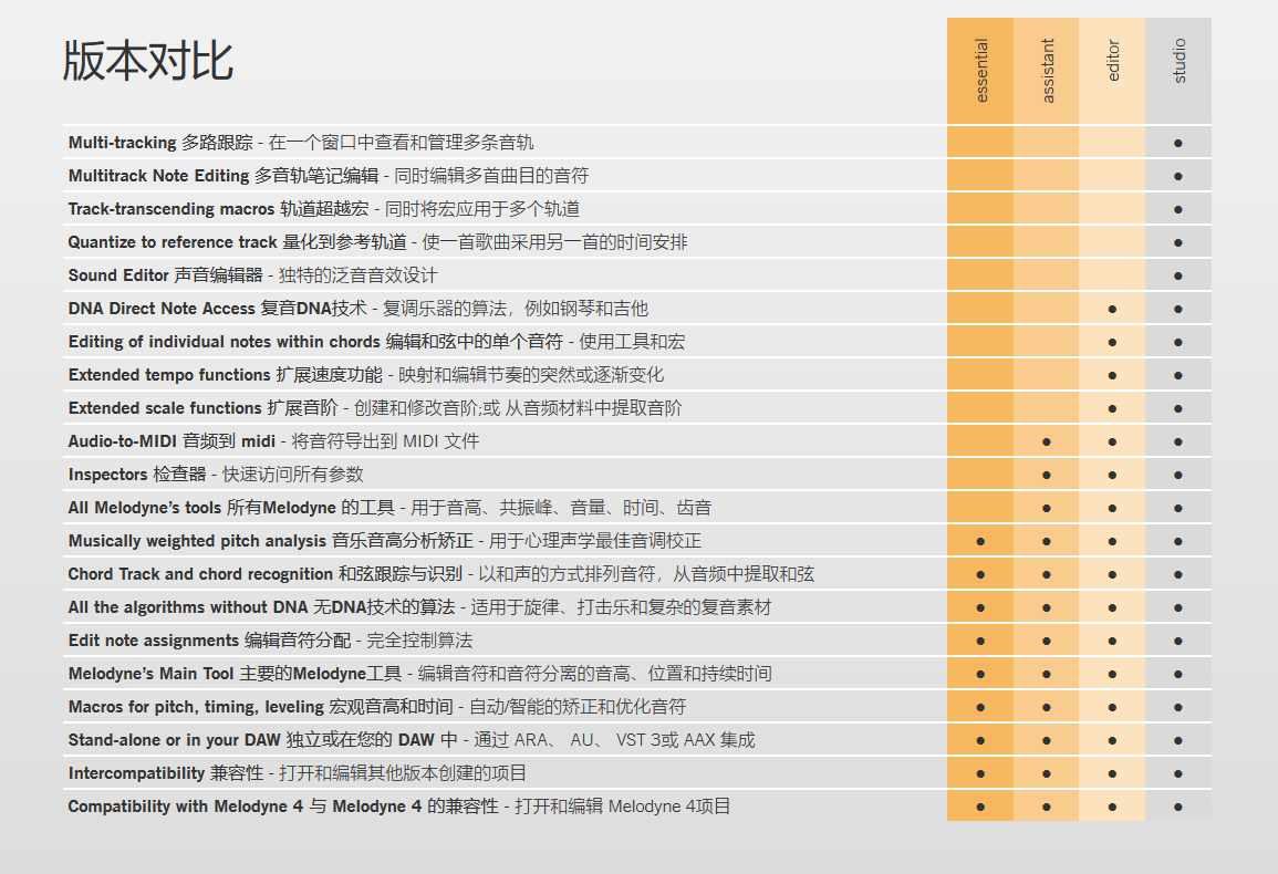 旗舰版本, Melodyne 5 studio具有Melodyne的所有独特功能和可能性。适用于专业人声编辑、合唱团、各种乐器和样本。并且在易用性和音乐性方面具有无与伦比的多轨工作流程。