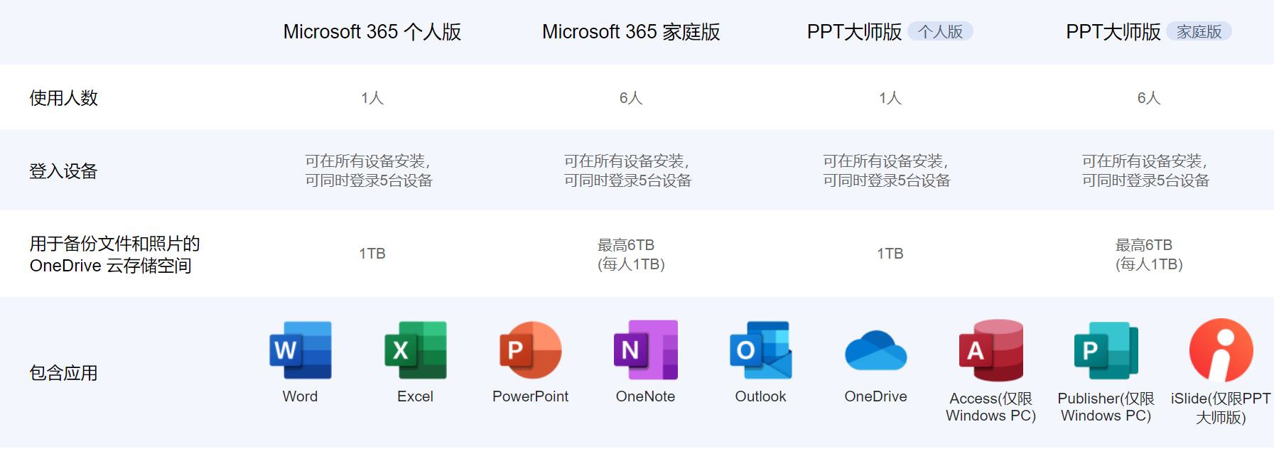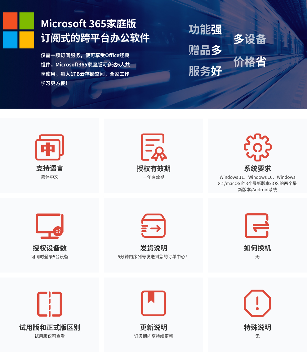 家庭版Office,支持6个用户,每个用户5台设备,每用户1TB云空间,包含Word,Excel、PowerPoint等常用办公软件,订阅期一年内免费更新。最适合学校及小工作室使用,最多支持30台设备,包括Windows电脑、苹果电脑、iPhone和安卓。